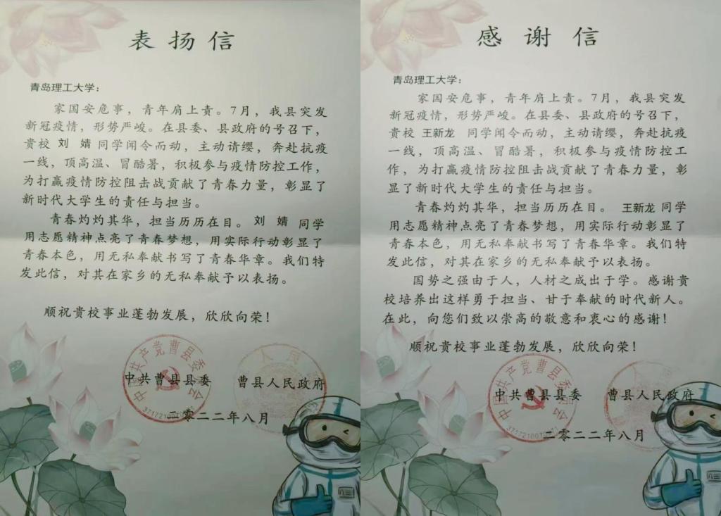 近日,402cc永利官网收到三封感谢信,中共曹县县委、中共潜山市委组织部分别对财管204班王新龙、经贸212班刘婧及经济211班卢浩三位同学的志愿服务行动和青春担当精神表示感谢和赞扬。