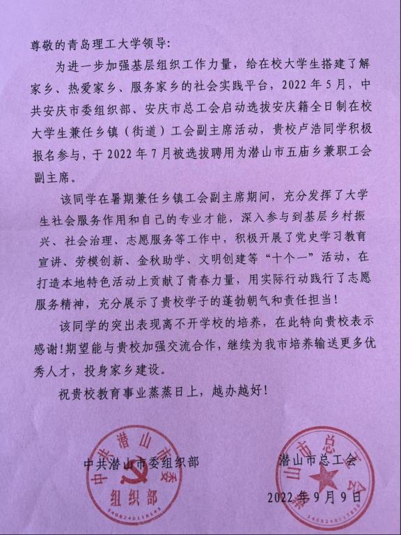 经济211班卢浩同学在暑期被聘任为安徽省潜山市五庙乡兼职工会副主席,在职期间,他充分发挥自身专业才能,配合当地政府,积极组织开展“劳模创新”、“金秋助学”等“十个一”系列活动,深入参与到基层工作当中,在乡村振兴、社会治理、志愿服务等方面,主动作为、乐于奉献,认真贯彻当地政府诸多利民政策,为家乡发展贡献青春力量。