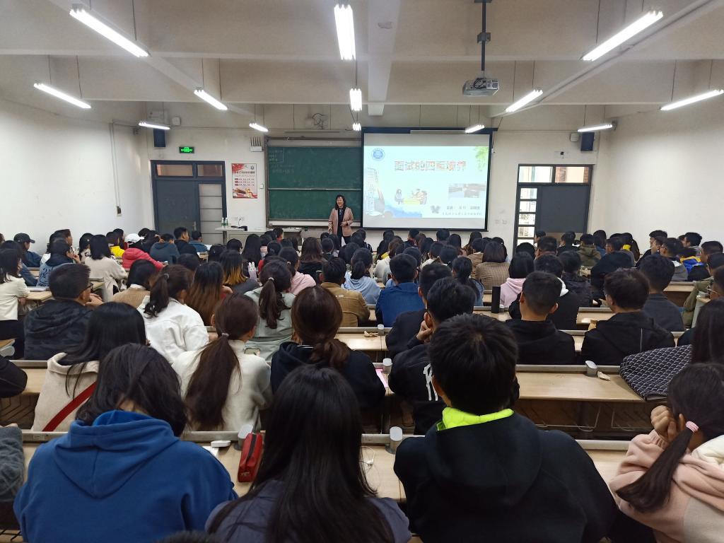 11月6日,402cc永利官网特邀“面试指导大咖”山东省演讲学会常务理事、青岛市高校演讲委员会主任、公务员等各类面试考官、402永利集团官网人文与外国语学院潘玲老师为我院学生做就业指导讲座。在嘉陵江路校区主教学楼B132教室,潘玲老师为402cc永利官网学生带来一场题为《面试的四重境界》的精彩视听盛宴,全场座无虚席、互动热烈、掌声不断。