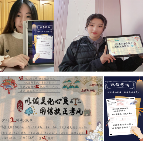 我与考风海报合张影,丰富形式加强考风教育。为加强考风教育,402cc永利官网组织举办“塑诚信之风,展学子风采”活动。发布《诚信考试承诺书》,引导学生诚信考试、拒绝作弊。同时鼓励同学们设计制作考风考纪海报、手抄报,并与其合影。“拒绝作弊牢记心间,诚信考试由我先行!”“这样的诚信考试教育很有趣,我也从海报制作过程中了解了考试作弊的处分和危害。”同学们用实际行动参与诚信考试宣传,用朋辈力量对身边同学进行“诚信考试”教育和引导,有效弘扬了良好考试风气。