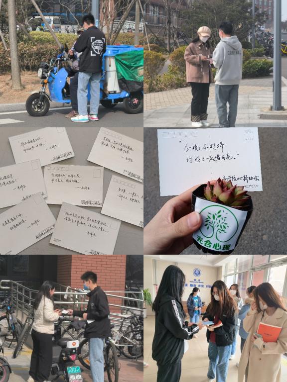 心理锦囊滋养健康的心灵,暖心小贴士用“红心理”供给精神养料。“恰同学少年,风华正茂;书生意气,挥斥方遒。”财管221孙雅婧同学与同伴分享着自己抽到的心理健康小锦囊。活动现场的心理健康小锦囊上用一个个暖心小贴士滋养学生心灵。小贴士上有的写着心理健康调试技巧,帮助同学们正确认识心理健康、学会自我调试,有的写着红色诗词,引导同学们在诗词中汲取精神养料,增强路径思维和动力思维,积累红色心理力量。