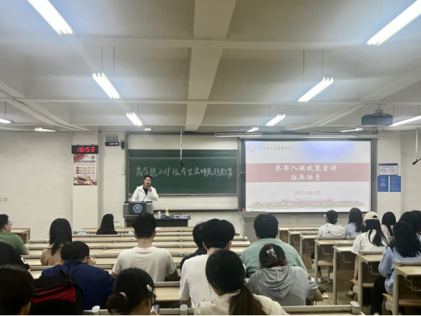 征兵固国防,军营献青春。为使同学们对入伍流程、国家政策等方面有更深入地了解,学院辅导员袁涛对毕业生进行了征兵宣讲,对参军入伍的报名方法和注意事项进行了详细介绍。“国无防不立,民无兵不安”,保家卫国、抵抗侵略是每一个公民的神圣职责,鼓励学生踊跃参军入伍,报效祖国。