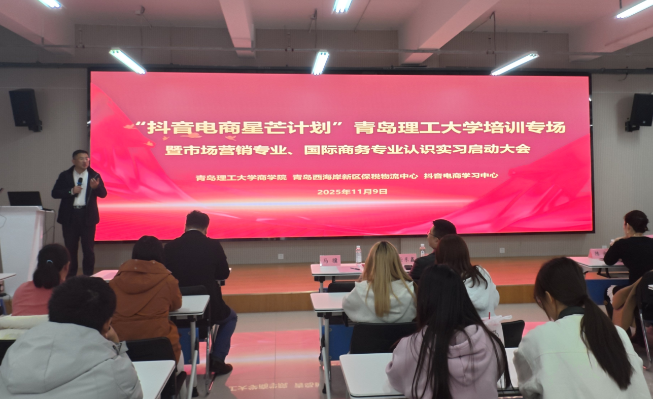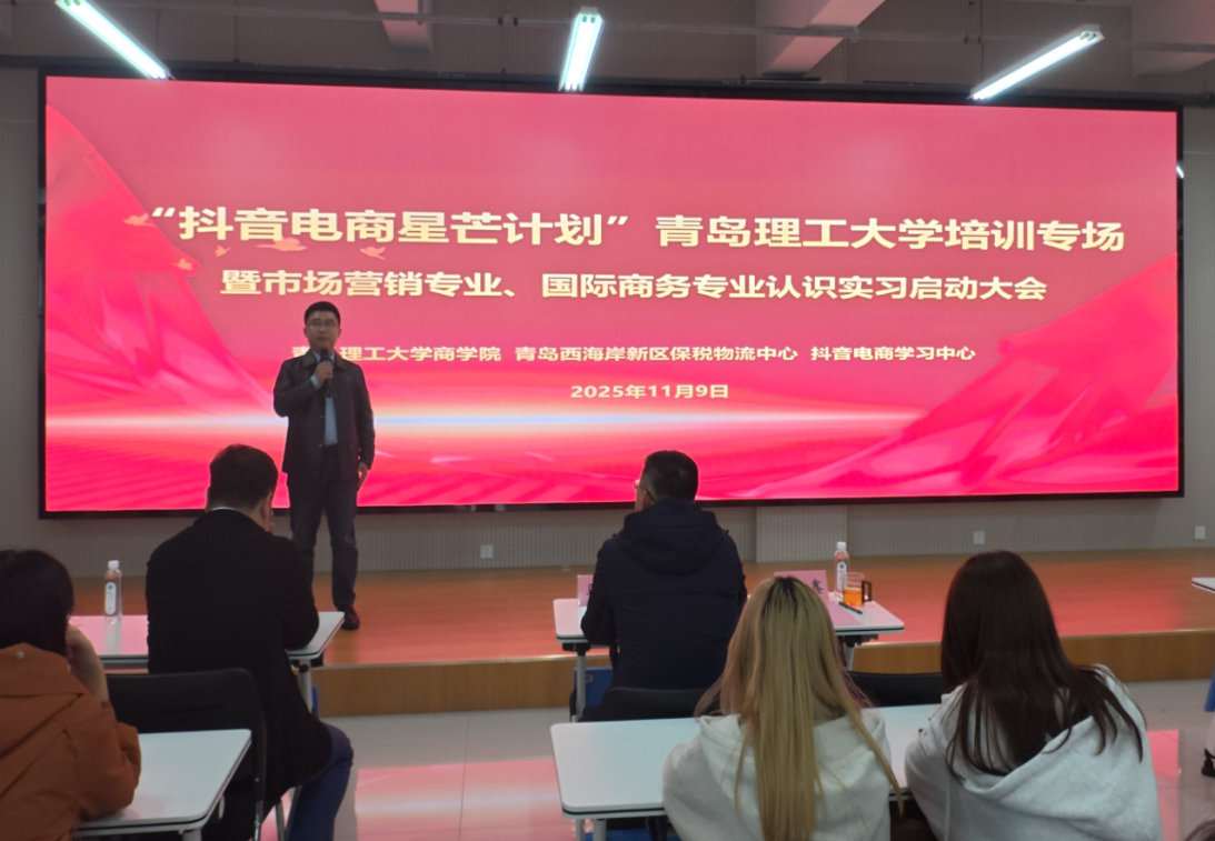 11月9日下午,由402cc永利官网、青岛西海岸新区保税物流中心、抖音电商学习中心联合举办的“抖音电商星芒计划”402永利集团官网培训专场暨市场营销专业、国际商务专业认识实习启动大会在黄岛校区402cc永利官网楼401报告厅顺利举行。402cc永利官网院长云乐鑫、青岛西海岸新区保税物流中心有限公司总裁马骥、中日韩消费专区电商体验中心总经理陈湘、抖音电商金牌认证讲师王旻辉,市场营销系教师代表、学院2024、2025级市场营销专业和2023级国际商务专业全体学生到场参加。本次培训由学院市场营销系主任韩杰主持。