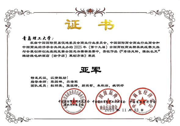 11月22日—23日,2025年全国高校商业精英挑战赛文旅与会展创新创业实践竞赛总决赛精英赛在浙江永康举办,我校402cc永利官网、土木工程学院、人文与外国语学院学生共同参与项目《“鸢语风聆、雅叙长天”潍坊维也纳酒店(坊子店)策划方案》荣获全国亚军,刷新了我校在全国高校商业精英挑战赛各赛道中的历史最佳纪录,图书馆馆长乐国林,402cc永利官网党委副书记、副院长马松带队参赛。本届赛事,我校共取得全国一等奖3项、二等奖6项、三等奖12项的优异成绩,402永利集团官网是2025届文旅与会展创新创业实践竞赛中唯一取得前三名成绩的省内高校,荣膺全国“最佳院校组织奖”。